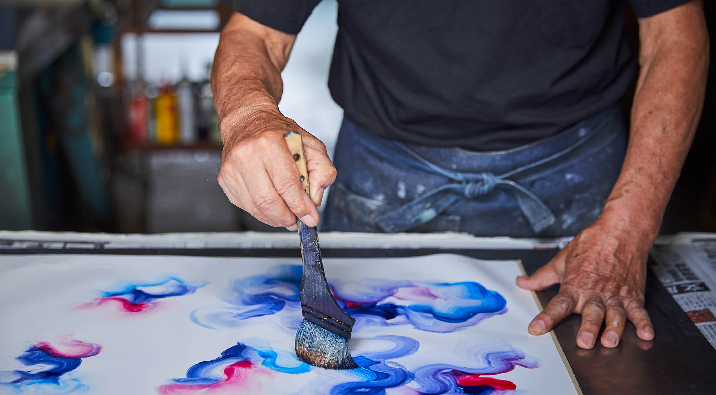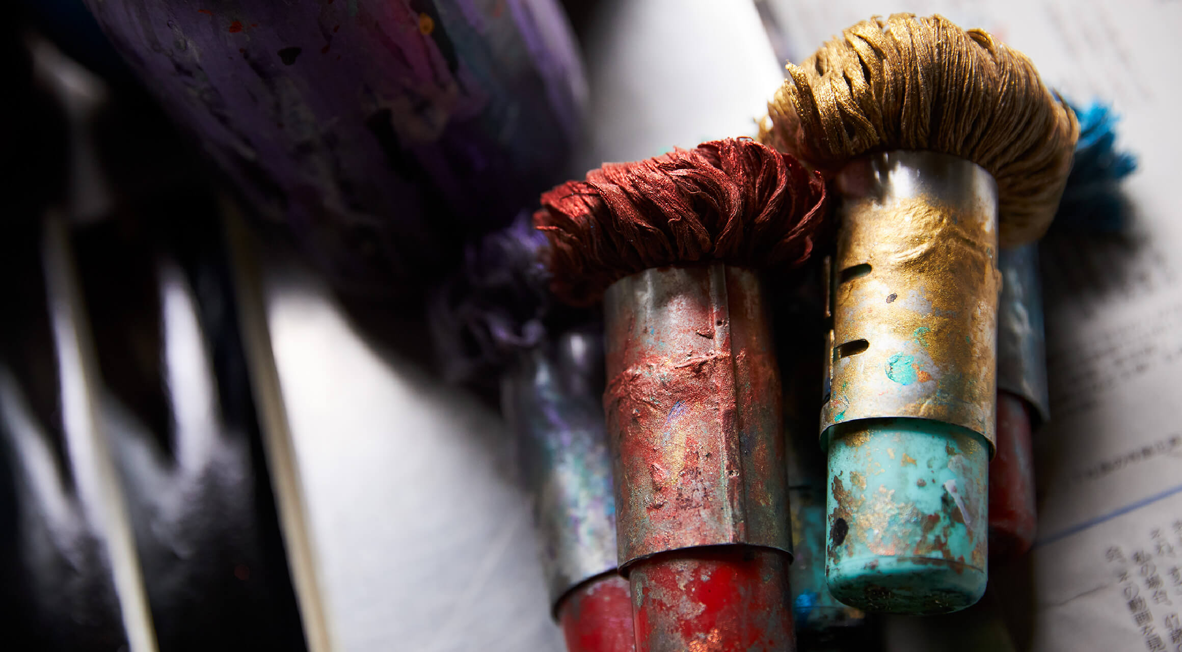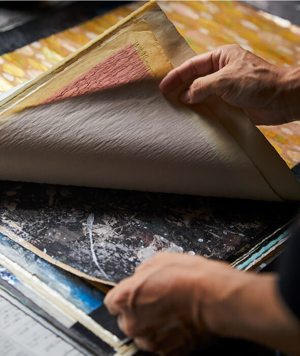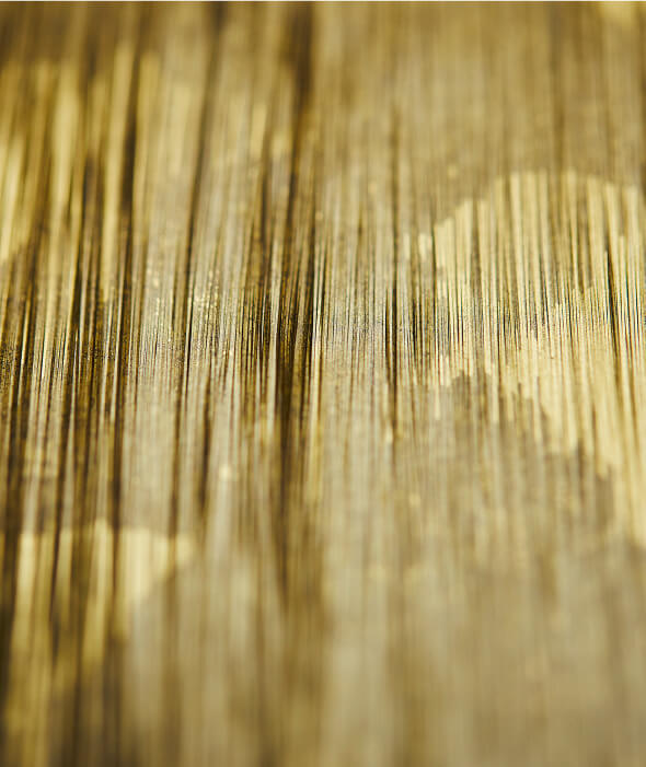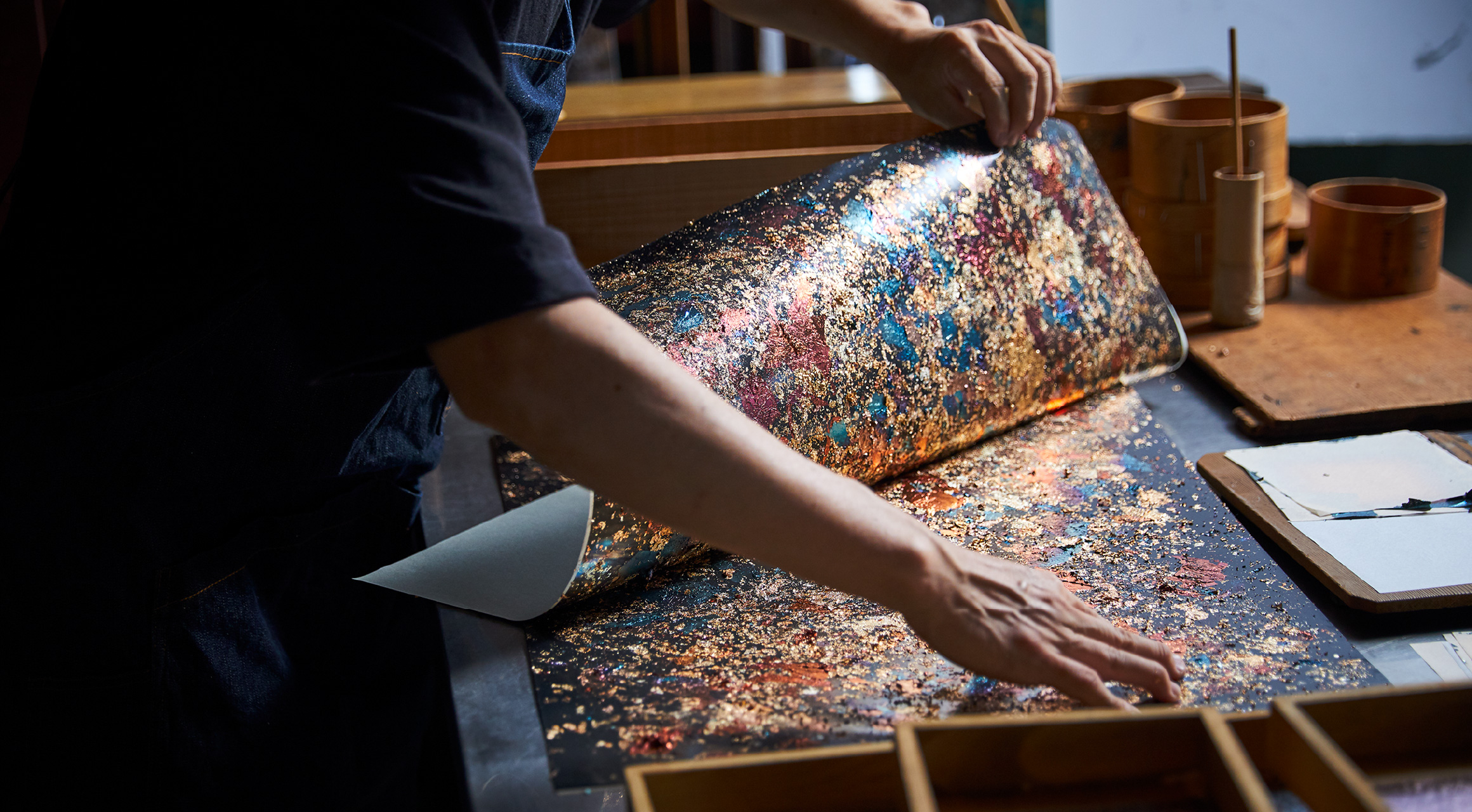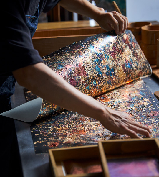 Traditional "hikihaku" is made by applying lacquer as an adhesive to the surface of washi paper, and then pressing (or affixing) gold or silver foil to it. Nowadays, it is mainstream to express unique patterns using not only gold and silver leaf but also various materials and tools. These patterns are cut into hair-thin strips in certain directions at a specialized cutting room.