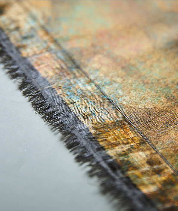楽芸工房は、京都・西陣で箔屋としての歴史を重ねてきた村田商店の直営工房・意匠部として平成元年に創業しました。長年、西陣織の特徴のひとつである引箔の製造を行ってきました。300年以上前に開発されたと言われているこの引箔による箔を織り込む技術を、楽芸工房は今もなお支え守り続けています。初代当主・村田輝義(2代目 善右衛門)は世界に誇る西陣織の芸術性と高度な技術を継承する一方、伝統工芸の枠を超えた新たなモノづくりにも積極的に取り組みました。アート、デザイン、インテリア、ファッションなど、幅広いジャンルと接点をつくりながら、国内外のマーケットに向けて革新的なデザインを提案してきました。