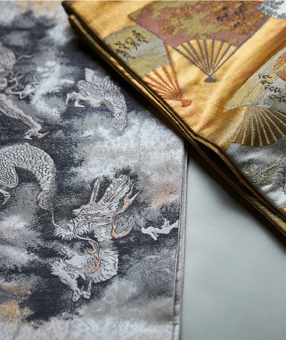 The lavish gold and silver shine of Nishijin-ori obi fabrics is expressed by the use of "hikihaku" (a traditional Japanese masking technique). hikihaku has been one of the most expensive materials used in Nishijinn weaving since ancient times. The traditional technique for weaving it into textiles is also called "hikihaku".